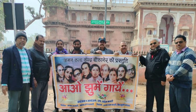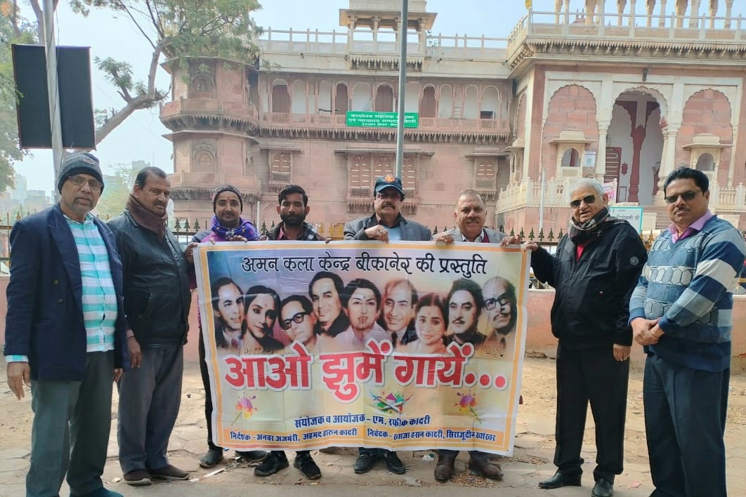 आईरा समाचार बीकानेर ।अमन कला केंद्र द्वारा आगामी 12 जनवरी को शाम 6 बजे प्रस्तावित नए साल के आगमन पर टाउन हॉल में आयोजित रंगारंग फिल्मी गीतों का कार्यक्रम आओ झूमे गाए के बैनर का विमोचन शनिवार को दोपहर को शहर के रतन बिहारी पार्क प्रांगण में किया गया । संस्था के अध्यक्ष एम .रफीक कादरी ने बताया की इस अवसर पर समाजसेवी एन डी रंगा, सैयद अख्तर अली, यशपाल नागपाल, ललित शर्मा, एम. रफीक कादरी ,अनिल गुप्ता , भवानी आचार्य,चांद मोहम्मद एवं गोवर्धन जोशी सहित अनेक संगीत कला प्रेमी उपस्थित थे। याद रहे 12 जनवरी को टाउन हॉल में शाम 6 बजे नए साल पर आओ झूमे गाएं कार्यक्रम आयोजित किया जाएगा।