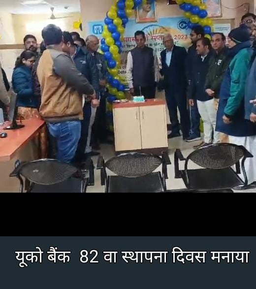 यूको बैंक का 82वां स्थापना दिवस शनिवार को यूको बैंक शहर शाखा भुजिया बाजार में मनाया गया इस अवसर पर वरिष्ठ शाखा प्रबंधक राहुल रॉय तथा रिटायर्ड एजीएम श्री त्रिलोक चंद कोचर ने केक काटकर यूको बैंक का 82वां स्थापना दिवस मनाया। इस अवसर पर बैंक की शाखा परिसर को सजाया गया और बैंक के गणमान्य खाता धारकों के साथ एक कस्टमर मीटिंग का आयोजन किया गया मीटिंग का संचालन बैंक कर्मचारी सुभाष चंद्र दहिया ने किया इस अवसर पर बैंक के ग्राहकों को शाखा प्रबंधक श्री राहुल राय और सहायक शाखा प्रबंधक मीना वर्मा ने बैंक की विभिन्न जमा योजना और रन योजना के बारे में विस्तार से बताया इस अवसर पर ग्राहकों से ग्राहकों ने अपने अनुभव शेयर अनुभव शेयर किया और शाखा की कार्यप्रणाली पर संतोष व्यक्त किया इस कार्यक्रम में शाखा के अधिकारी श्री पवन कुमार मयंक सोलंकी श्वेता मीणा प्रदीप कुमार एवं संतोष आदि उपस्थित उपस्थित थे