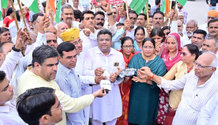 तानाशाही और गरीबों के खिलाफ अत्याचार बंद करे भाजपा सरकार बिशनाराम सियाग ।शहर देहात कांग्रेस का संयुक्त विरोध प्रदर्शन, विश्नोई धर्मशाला से पैदल मार्च, कलेक्टर को सौंपा ज्ञापन