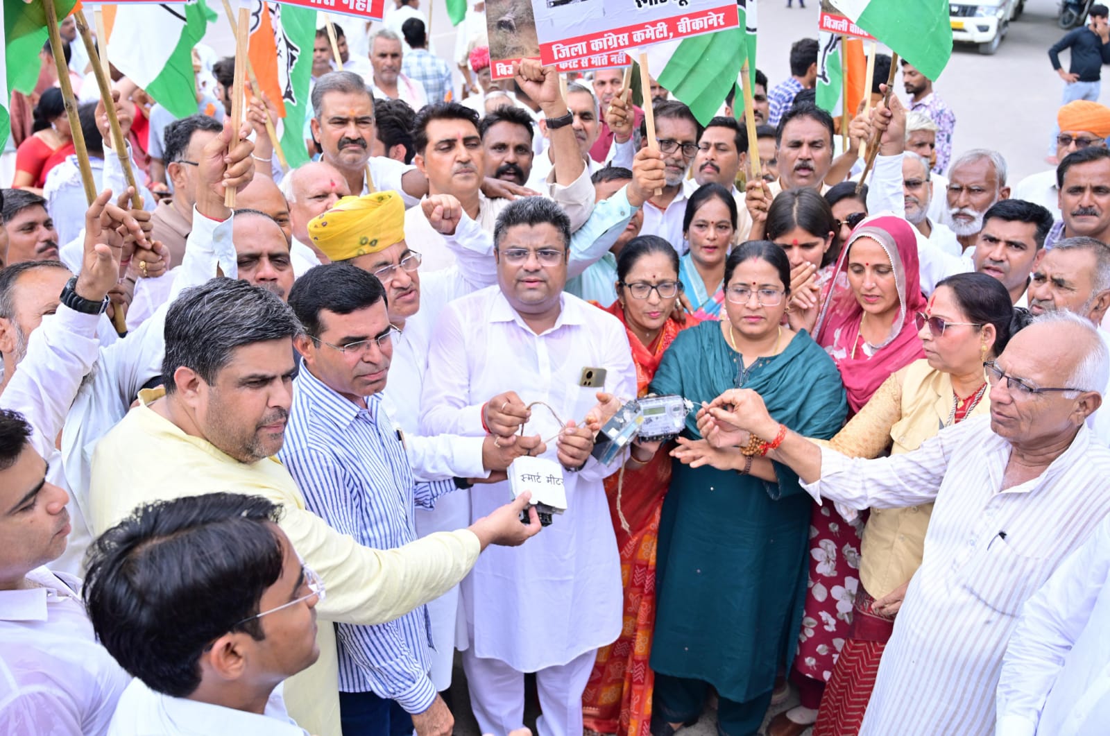 बीकानेर 22 जुलाई -राजस्थान प्रदेश कांग्रेस कमेटी के निर्देशानुसार बीकानेर शहर देहात जिला कांग्रेस कमेटी द्वारा राज्य की भाजपा सरकार के खिलाफ विरोध प्रदर्शन करते हुए पैदल मार्च कर जिला कलेक्टर को ज्ञापन सौंपा संगठन महासचिव नितिन वत्सस ने बताया कि राज्य की भाजपा सरकार द्वारा अलोकतांत्रिक तरीके से निकाय चुनावों को टालने, जबरदस्ती स्मार्ट मीटर के नाम से आमजन के जेबों पर डाका डालने, और पूरे राजस्थान में खासतौर से बीकानेर में जिस तरह कानून व्यवस्था लचर हुई है अपराधी बेखौफ घूम रहे है उसके खिलाफ आज विरोध प्रदर्शन किया गया और भाजपा सरकार को चेतावनी दी गई