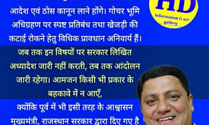 उन्होंने कहा कि जब तक सरकार इन विषयों पर लिखित अध्यादेश या आदेश जारी नहीं करती, तब तक जनहित में आंदोलन जारी रहेगा। उन्होंने आमजन से अपील की कि वे किसी भी प्रकार के बहकावे में न आएँ, क्योंकि पूर्व में भी इसी तरह के आश्वासन मुख्यमंत्री एवं राजस्थान सरकार द्वारा दिए गए थे, लेकिन उनका कोई ठोस परिणाम आज तक सामने नहीं आया।रंगा राजस्थानी राहुल ने कहा कि गाय, गोचर और खेजड़ी केवल पर्यावरण या आस्था का विषय नहीं, बल्कि राजस्थान की सांस्कृतिक पहचान और ग्रामीण जीवन की रीढ़ हैं। इनके संरक्षण के लिए सरकार को तुरंत प्रभावी कदम उठाने होंगे।रंगा राजस्थानी राहुल कवि, कथाकार, गीतकार एवं संस्कृतिकर्मी