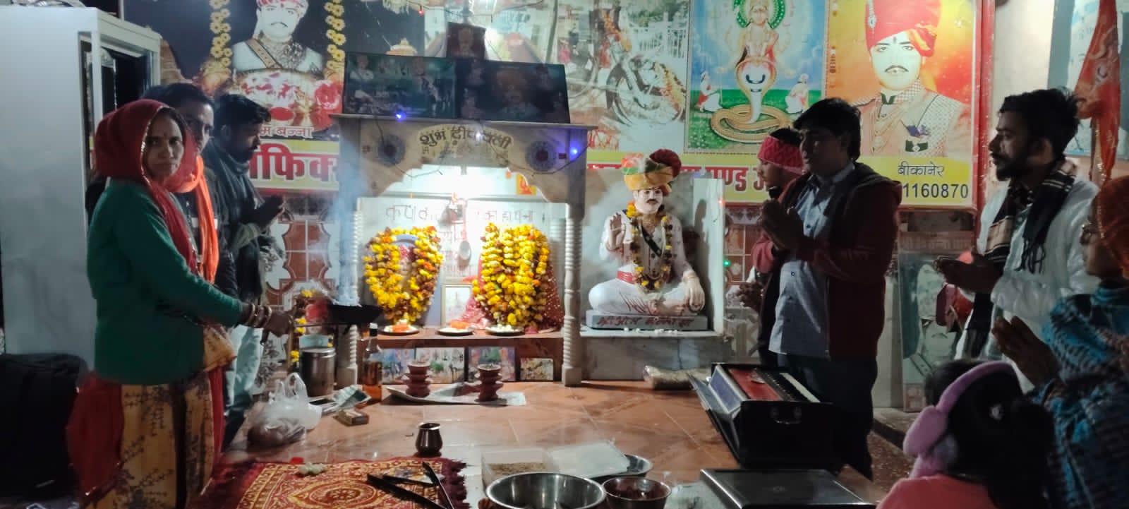 आईरा बीकानेर बीकानेर। अभिलेखागार कार्यालय के एमएन अस्पताल के सामने स्थित ओम बन्ना (बुलेट बाबा) मंदिर में दिनांक 26/1/20-26 सोमवार को अष्टमी के दिन विशेष ज्योत (दीपक) जलाई गई, मंदिर पुजारन भंवरी देवी ने मंगलवार को प्रेस विज्ञप्ति में बताया कि सोमवार की संध्या को अष्टमी के विशेष दिन पर ओम बन्ना के सेवकों एवं भक्तजनों द्वारा ज्योत , मन्नत स्वरूप दीपक और प्रसाद चढ़ाया। बन्ना के मंदिर की ज्योत में दिव्य शक्ति है जो भक्तों के दुखों को हरती है। यहां पर मंदिर के प्रति लोगों की अटूट आस्था है कि बन्नासा सभी की मनोकामनाएं पूरी करते हैं। इस अवसर पर कलाकार छोटूसिंह राणा एंड पार्टी द्वारा भजनों की प्रस्तुतियां दी।मंदिर के सेवक प्रेम सिंह चांडी, भानू प्रताप सिंह बन्ना, नारायण राम सहित आदि के द्वारा भक्तजनों में प्रसादी वितरण की गई।