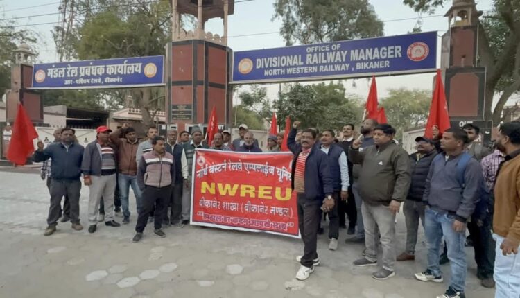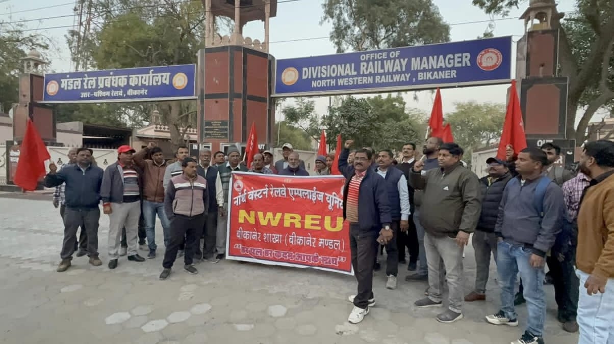 बीकानेर, 12 फरवरी। ऑल इंडिया रेलवे मैन्स फेडरेशन के आह्वान पर आज पूरे भारतीय रेल में कर्मचारियों ने प्रदर्शन किया। इसी क्रम में उत्तर पश्चिम रेलवे के बीकानेर मंडल में कॉम प्रमोद यादव मंडल सचिव के नेतृत्व में नॉर्थ वेस्टर्न रेलवे एम्प्लॉइज यूनियन के बैनर तले अखिल भारतीय मांग दिवस के रूप में अपना विरोध प्रदर्शन किया गया।